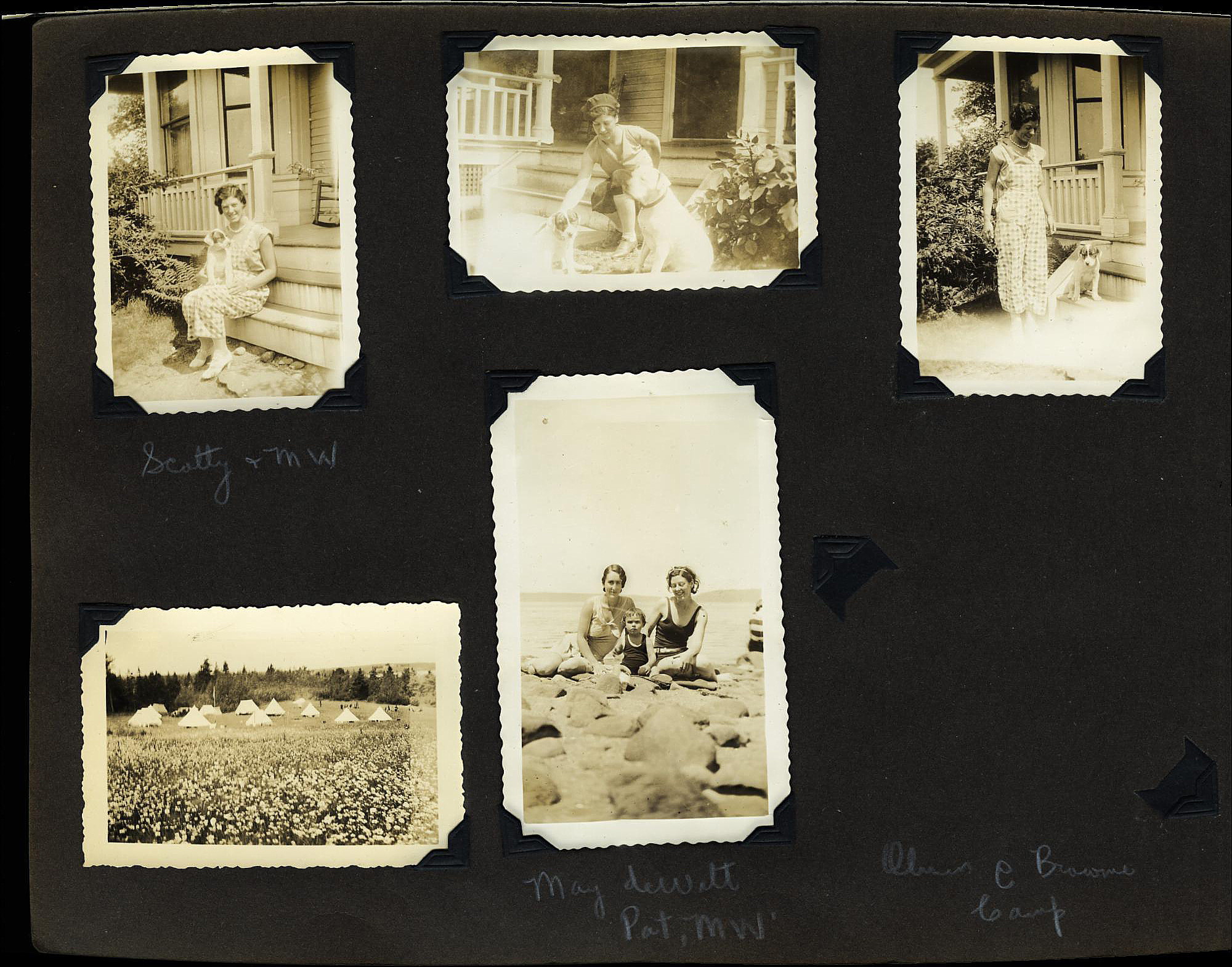 women and a young child sitting on a beach. Photo is labelled "May deWitt / Pat, M.W.".