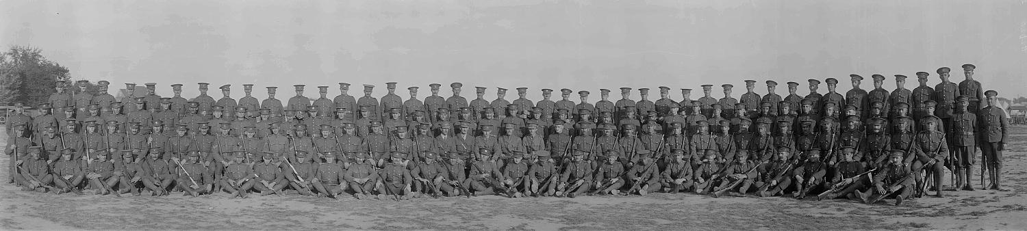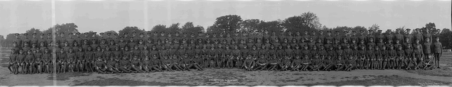 Photo caption reads: ' "A" Co. 169th Overseas Battalion, C.E.F. Camp Niagara 1916 '