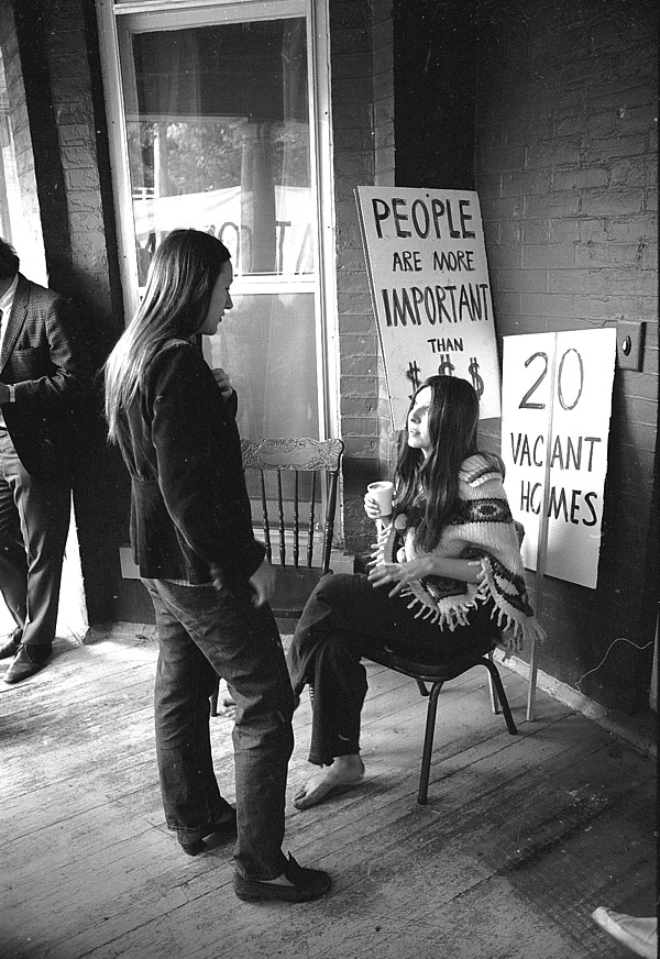 This series of photos was shot at 201 Beverley Street during a major crisis caused by the impending eviction of the tenants by Toronto Hydro. It was a devisive issue in Toronto because the tenants were without exception poor, and many were American draft resisters and their families. The series starts with a scan of the information leaflet issued by the co-op, general views of 201 Beverley Street, people with their children, co-op meetings, the officials serving the eviction papers, people moving their belongings out, media and at least two sympathetic politicians outside the house with residents, officials tearing down the signs, and finally a crowd in front of the co-op at night, possibly that night or soon after. I forget what happened that night but possibly someone tried to re-take possession of the houses. If you can identify anyone or provide more details